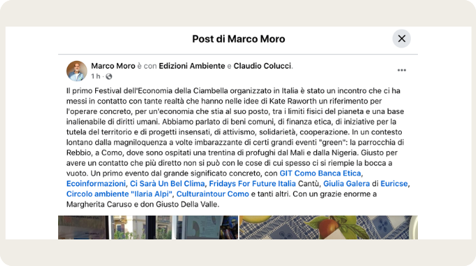 Con un post pubblicato su facebook, Marco Moro di Edizioni Ambiente – la casa editrice che ha pubblicato in Italia il saggio di Kate Raworth da cui il festival prende il nome – ha saputo restituire con lucidità e rara sensibilità il senso profondo di quella giornata straordinaria.
