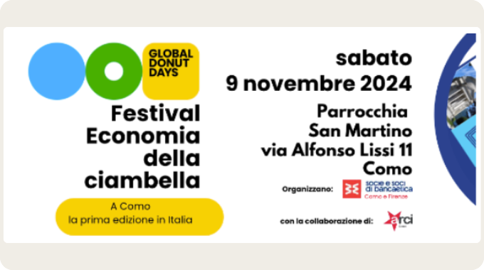 Al mattino verrà illustrato cos’è l’economia della ciambella, cos’è un Bene Comune e l’impatto della finanza etica su di esso e sulla comunità. In modo specifico parleremo del territorio lariano presentando esempi di progetti di Beni Comuni e alcune testimonianze che hanno visto i cittadini in azione per tutelarli.